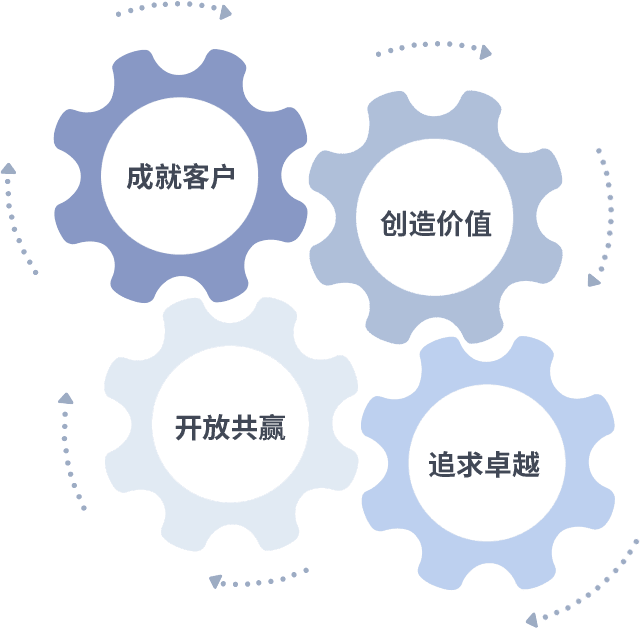 成就客户是一切决策的出发点,,,创造价值是衡量所有工作的标准,,,,追求卓越是我们做事做人的态度,,,开放共赢是我们的格局也是最终的结果。。价值观的齿轮环环相扣,,推动着组织里的每个人不断向前。。。。